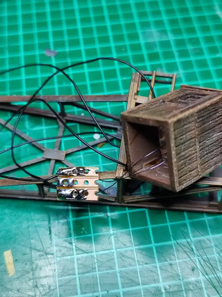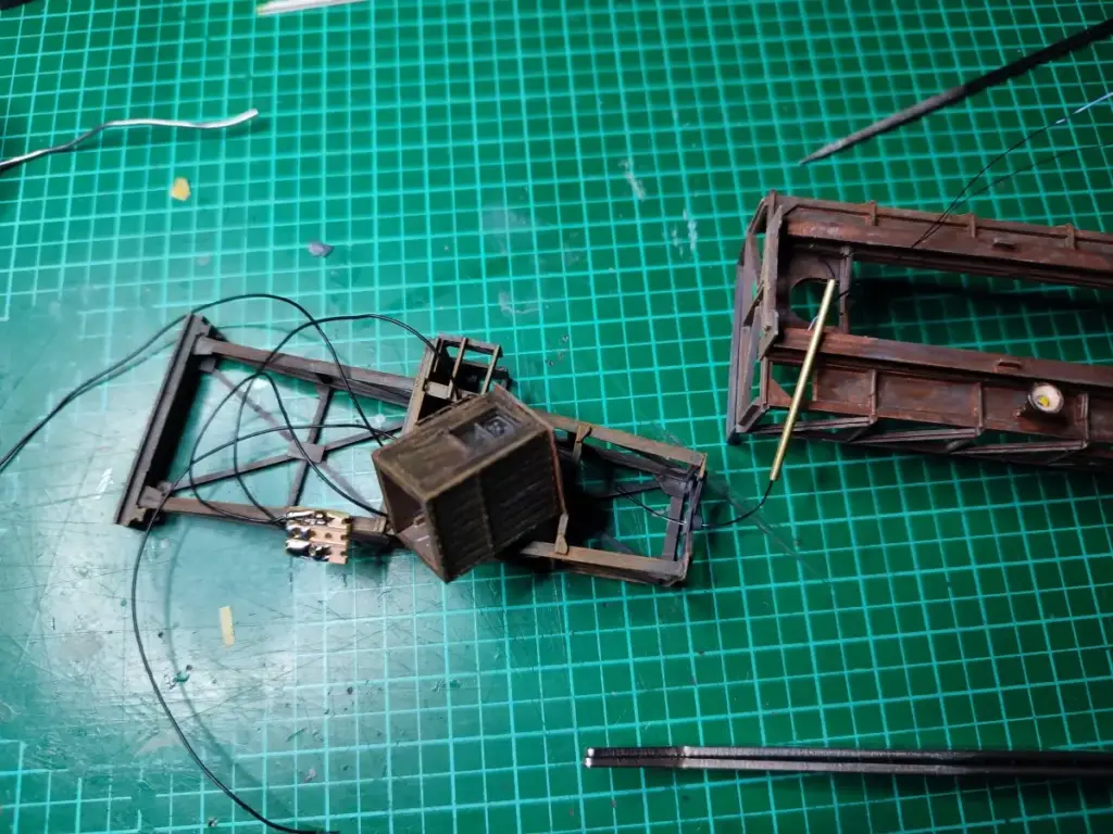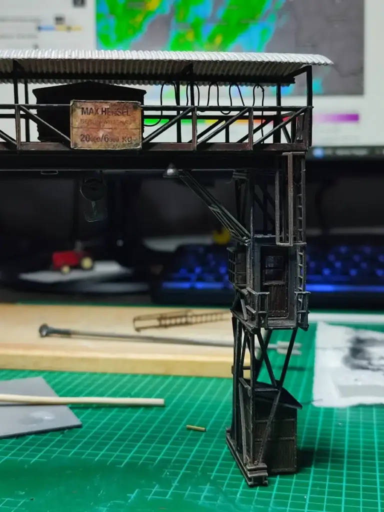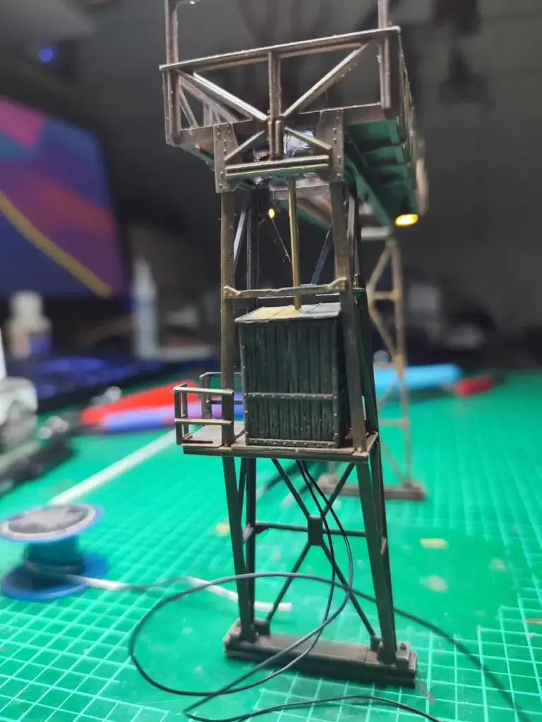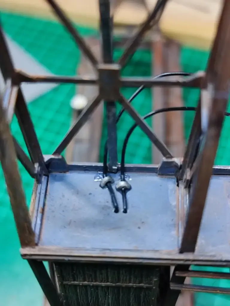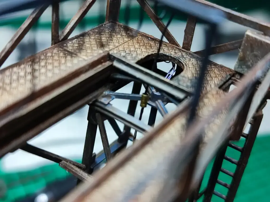 Im 12. Teil geht es um die Beleuchtung für den Kran und sie wird voll funktionsfähig. Es sind zwei Leuchten verbaut, jeweils eine für die Straßen- und eine für die Gleisseite. Es wurden die beiden Lampenschirme aus dem Bausatz genommen, aufgebohrt und mit SMD-LED 0605 versehen. Die Litzen an den LED’s wurden sichtbar verlegt und entsprechend mit Halterungen gesichert. Später wurden sie durch Messingrohre nach unten geführt in die Kabiene des Kranführers. Von dort wurden sie außerhalb, mit einem H-Träger getarnt, in den Schuppen geführt. Von dort geht es dann zur Batterie, unterhalb der Dioramabase.