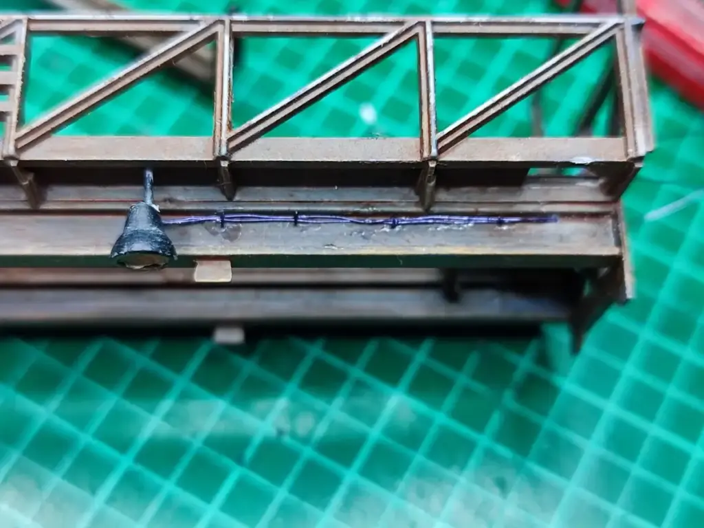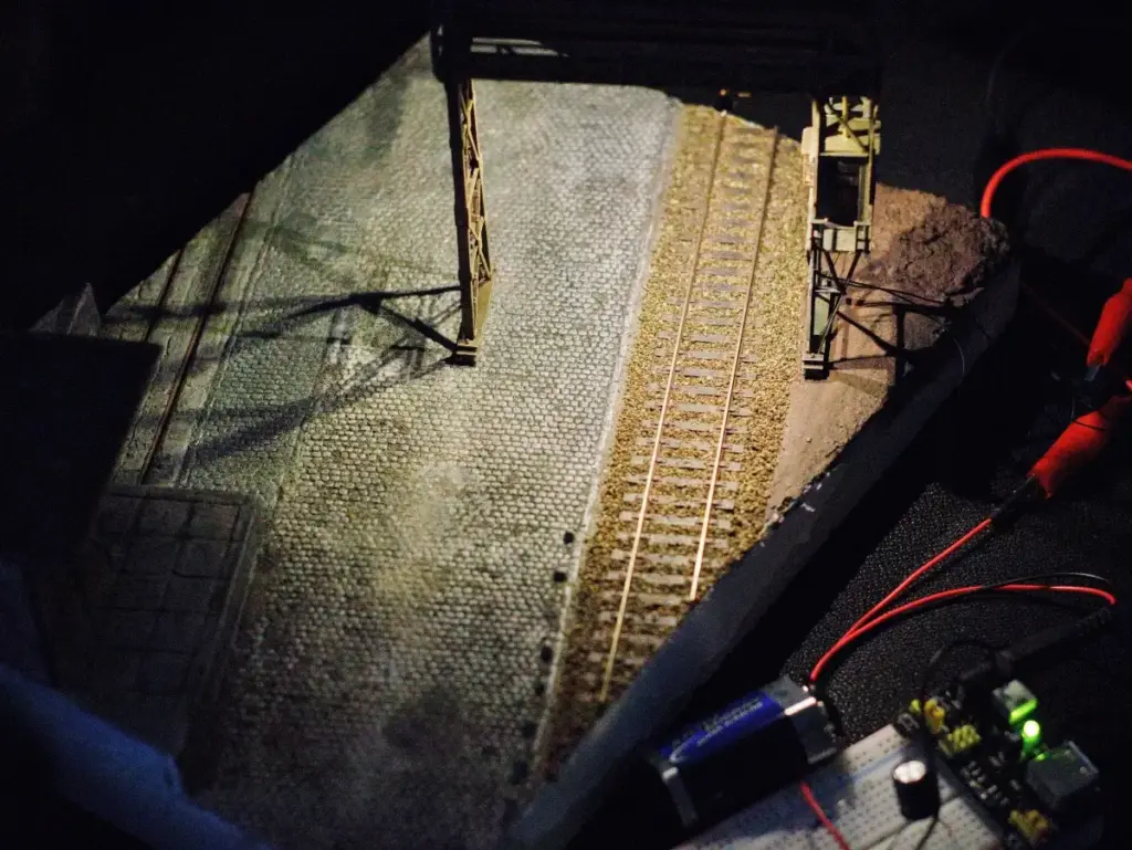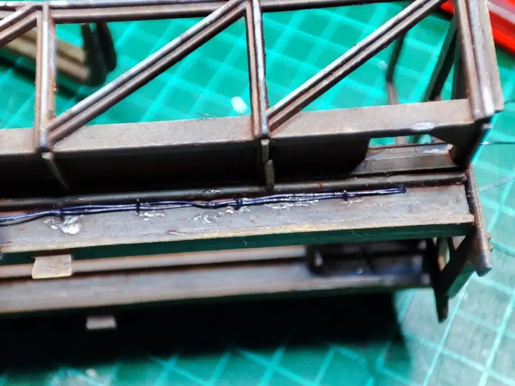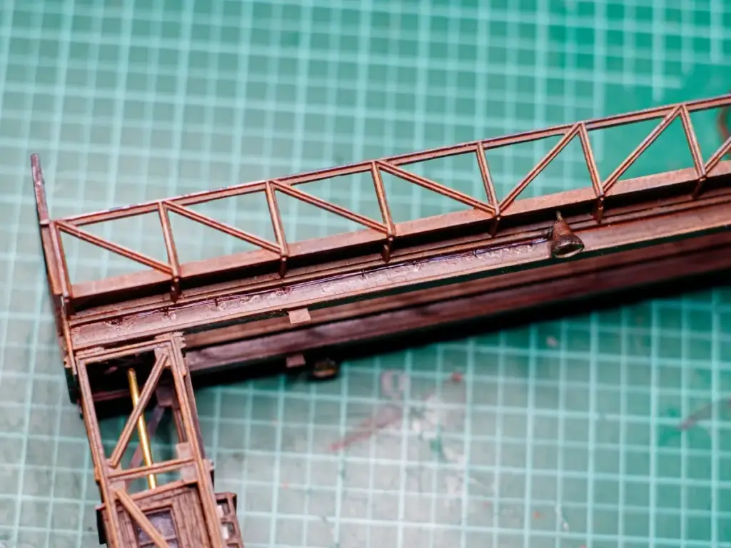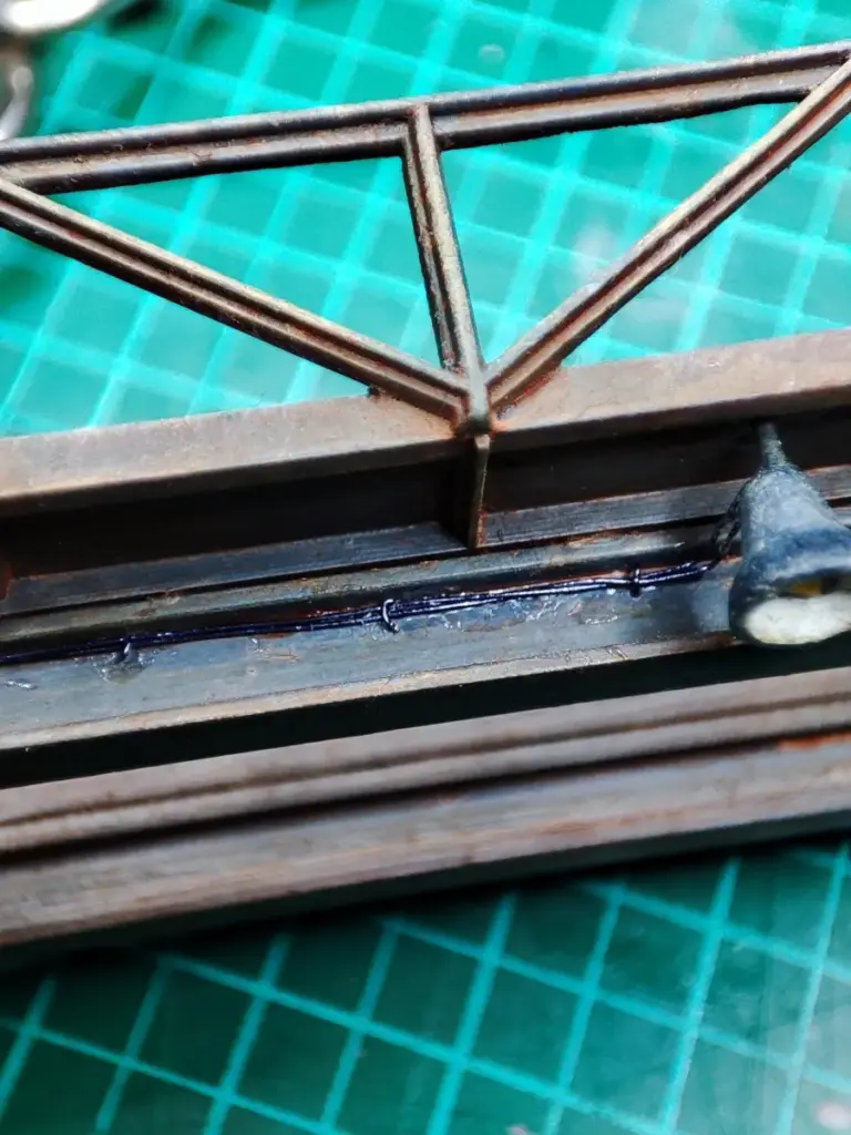 Im 12. Teil geht es um die Beleuchtung für den Kran und sie wird voll funktionsfähig. Es sind zwei Leuchten verbaut, jeweils eine für die Straßen- und eine für die Gleisseite. Es wurden die beiden Lampenschirme aus dem Bausatz genommen, aufgebohrt und mit SMD-LED 0605 versehen. Die Litzen an den LED’s wurden sichtbar verlegt und entsprechend mit Halterungen gesichert. Später wurden sie durch Messingrohre nach unten geführt in die Kabiene des Kranführers. Von dort wurden sie außerhalb, mit einem H-Träger getarnt, in den Schuppen geführt. Von dort geht es dann zur Batterie, unterhalb der Dioramabase.