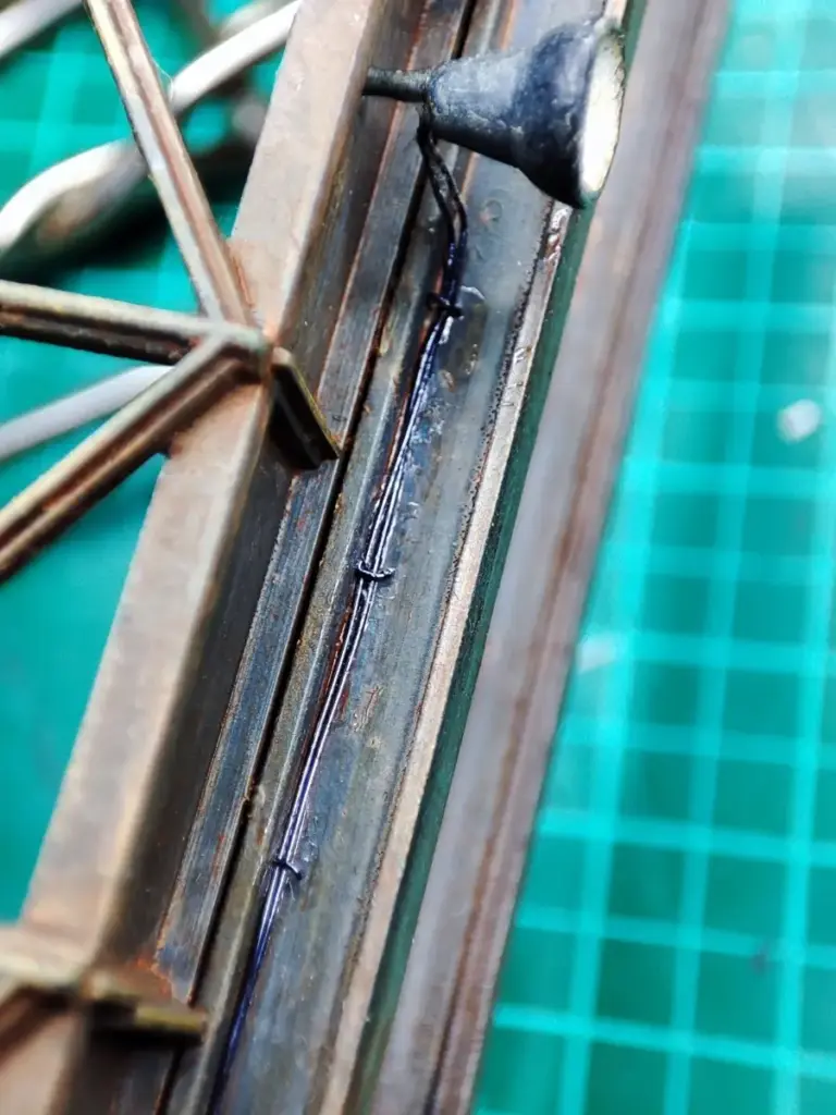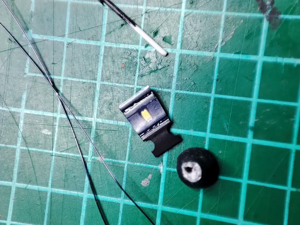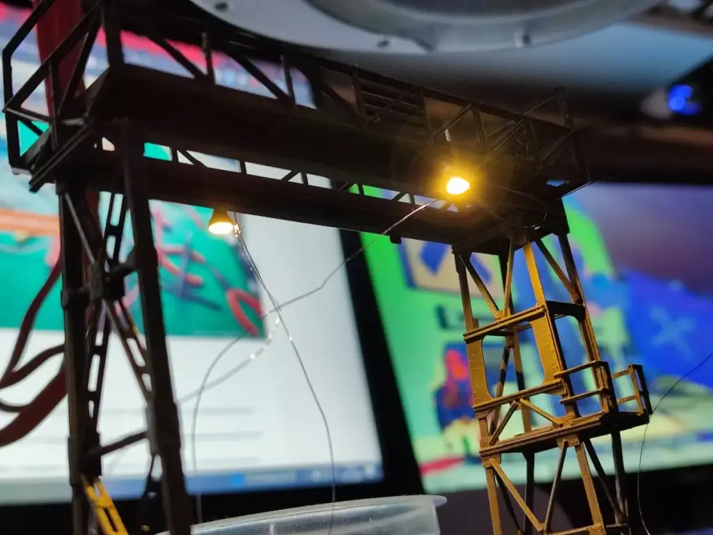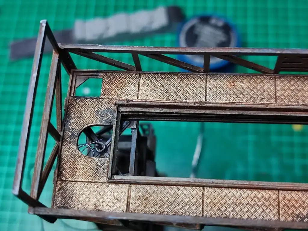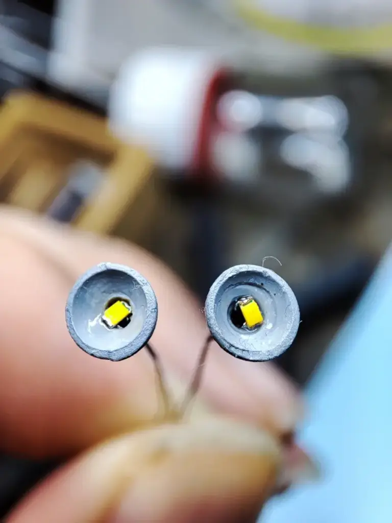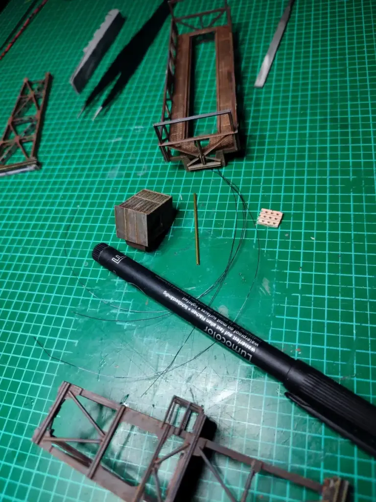 Im 12. Teil geht es um die Beleuchtung für den Kran und sie wird voll funktionsfähig. Es sind zwei Leuchten verbaut, jeweils eine für die Straßen- und eine für die Gleisseite. Es wurden die beiden Lampenschirme aus dem Bausatz genommen, aufgebohrt und mit SMD-LED 0605 versehen. Die Litzen an den LED’s wurden sichtbar verlegt und entsprechend mit Halterungen gesichert. Später wurden sie durch Messingrohre nach unten geführt in die Kabiene des Kranführers. Von dort wurden sie außerhalb, mit einem H-Träger getarnt, in den Schuppen geführt. Von dort geht es dann zur Batterie, unterhalb der Dioramabase.