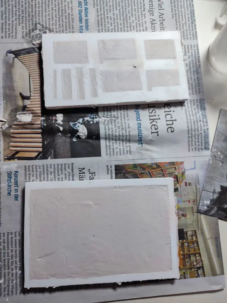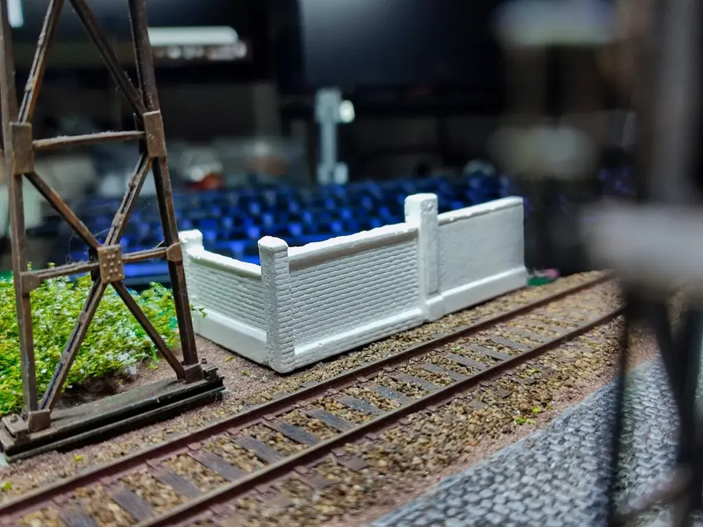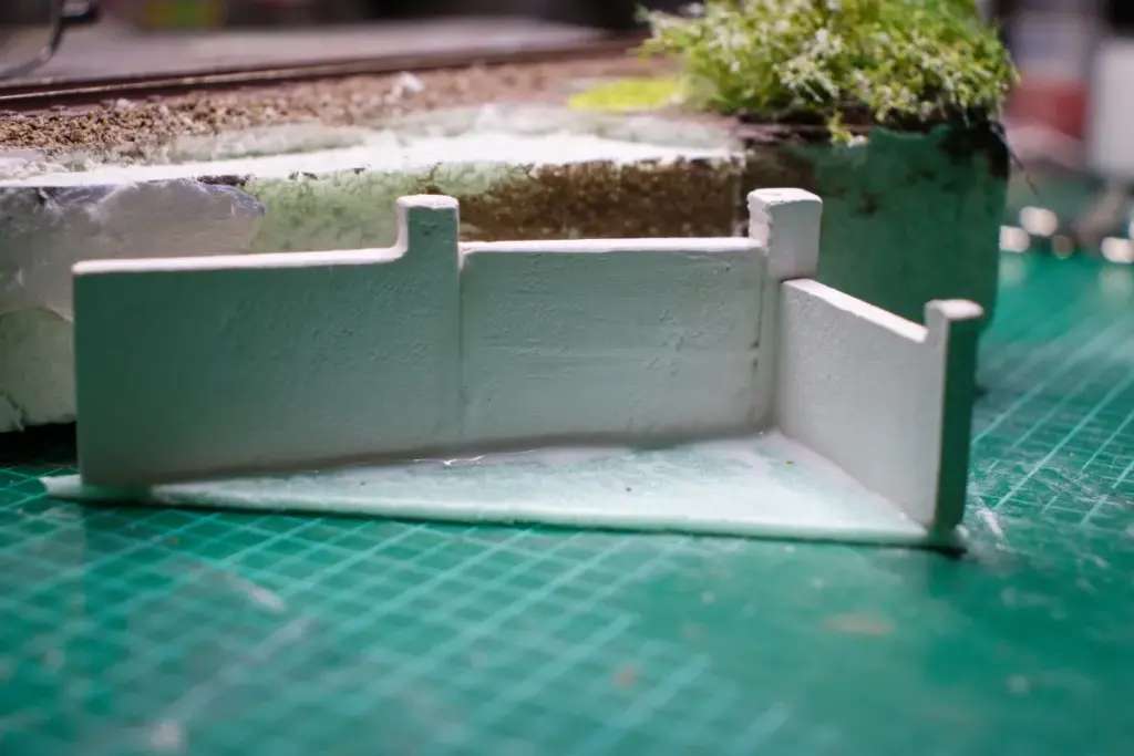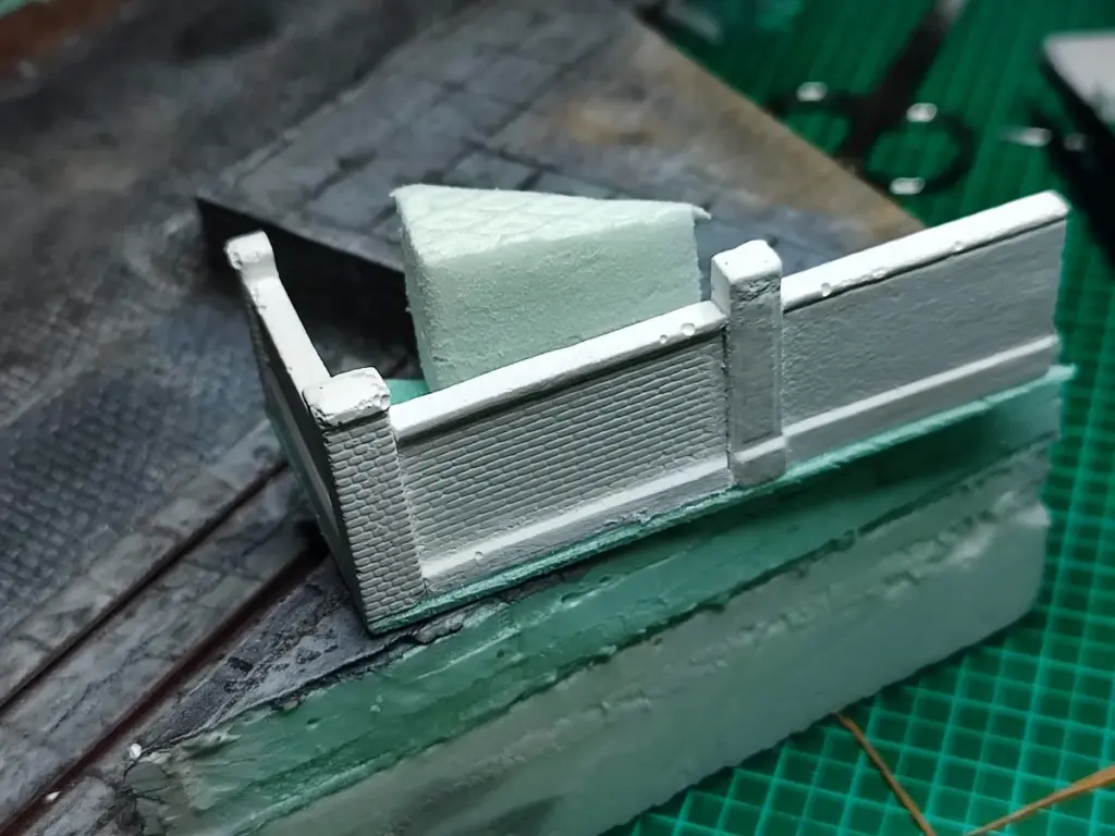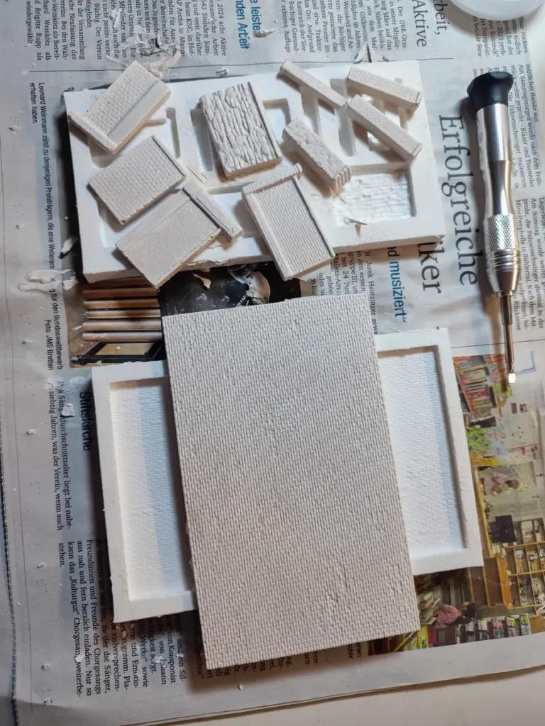 – Silikonform Nr. 7024 – 5 verschiedene Fabrik- und Hofmauern, 3 separate Pfeiler. Das „Minidiorama“ wird später in die Base eingelassen, damit die Übergänge besser versteckt werden können.