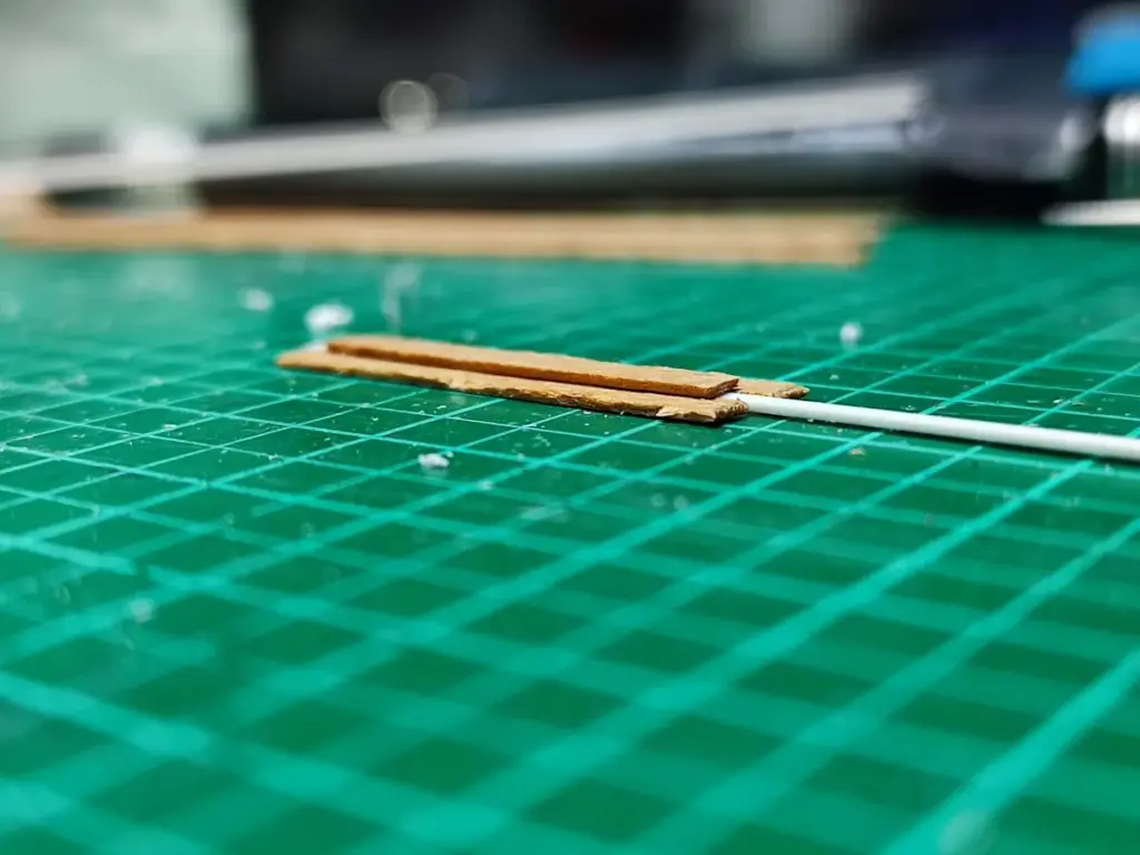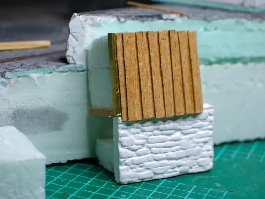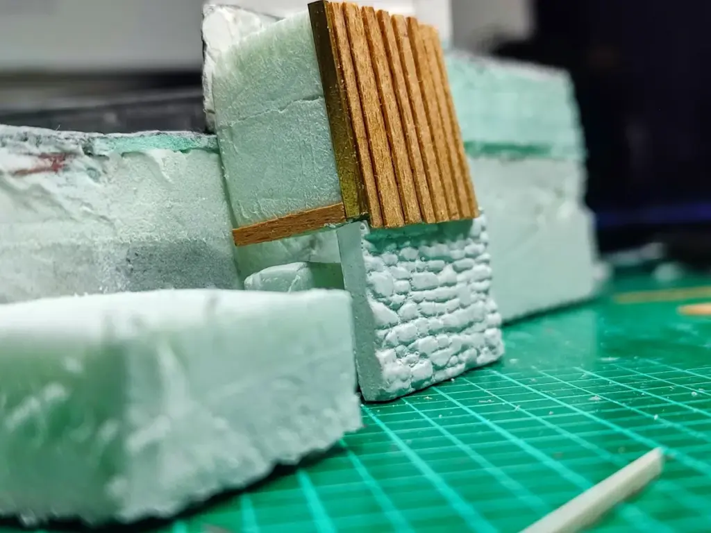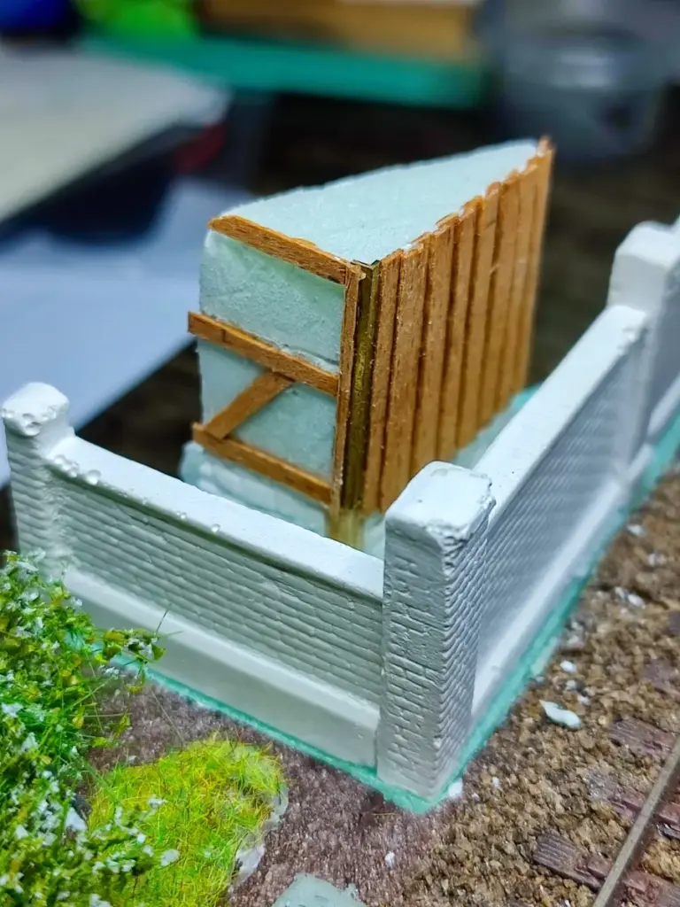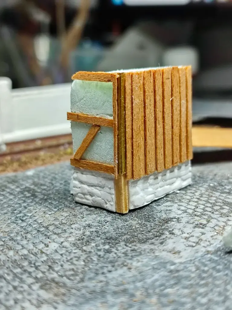 Weiterhin entschied ich mich für einen stark verwitterteten Schuppen mit Fachwerk und Holzwänden. Dies entsand komplett im Eigenbau aus Holz und Kupferfolie. Das Fachwerk wird mit Modellspachtelmasse von Bergswerk ausgefüllt. Die Natursteinmauer ist aus den oben genannten Silikonform entnommen und zurecht gesägt.