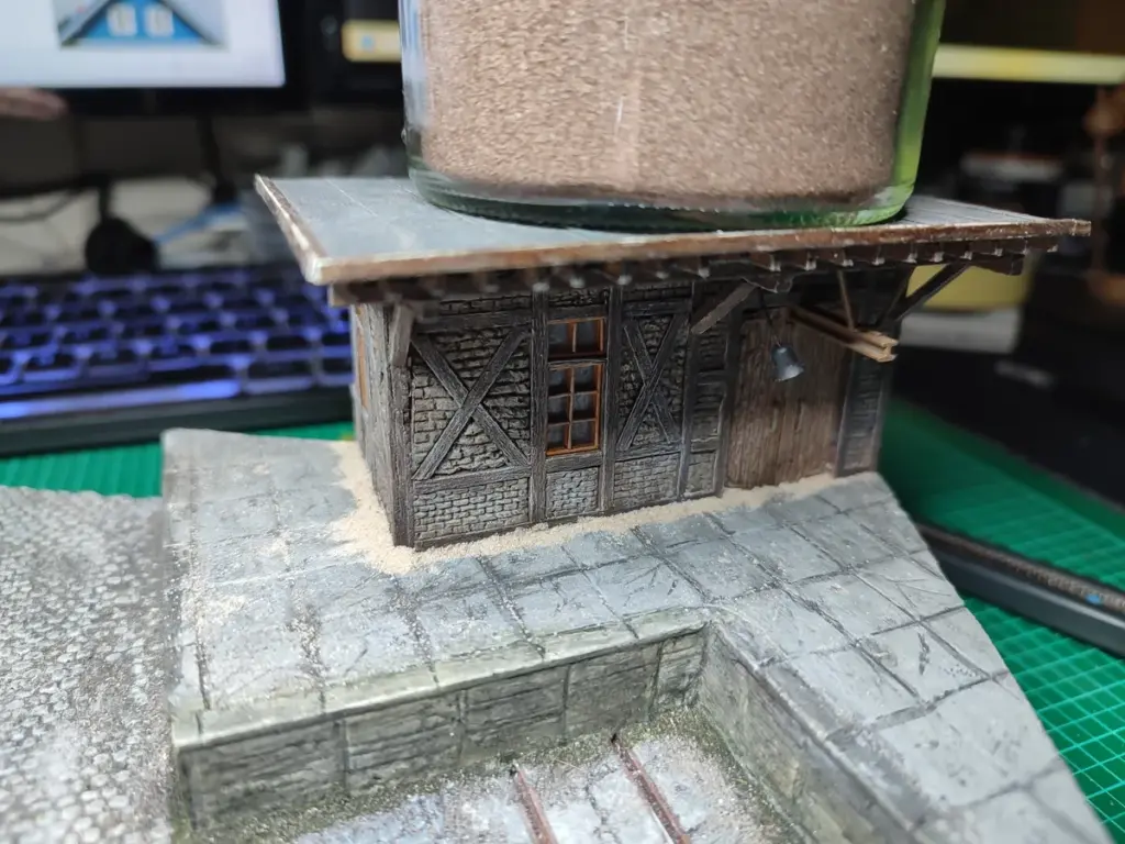 Die letzten Arbeiten am Diorama sind jetzt alle Teile, Kran, kleiner Schuppen und Gütterschuppen an ihre Plätze zu kleben, zu gestalten und die Beleuchtung anzuschließen.