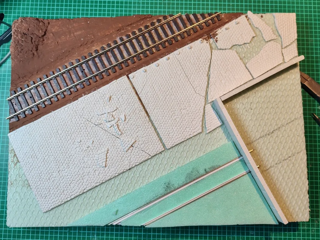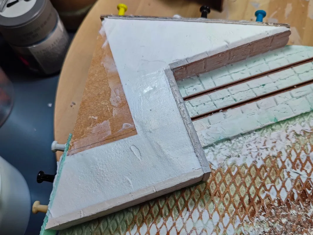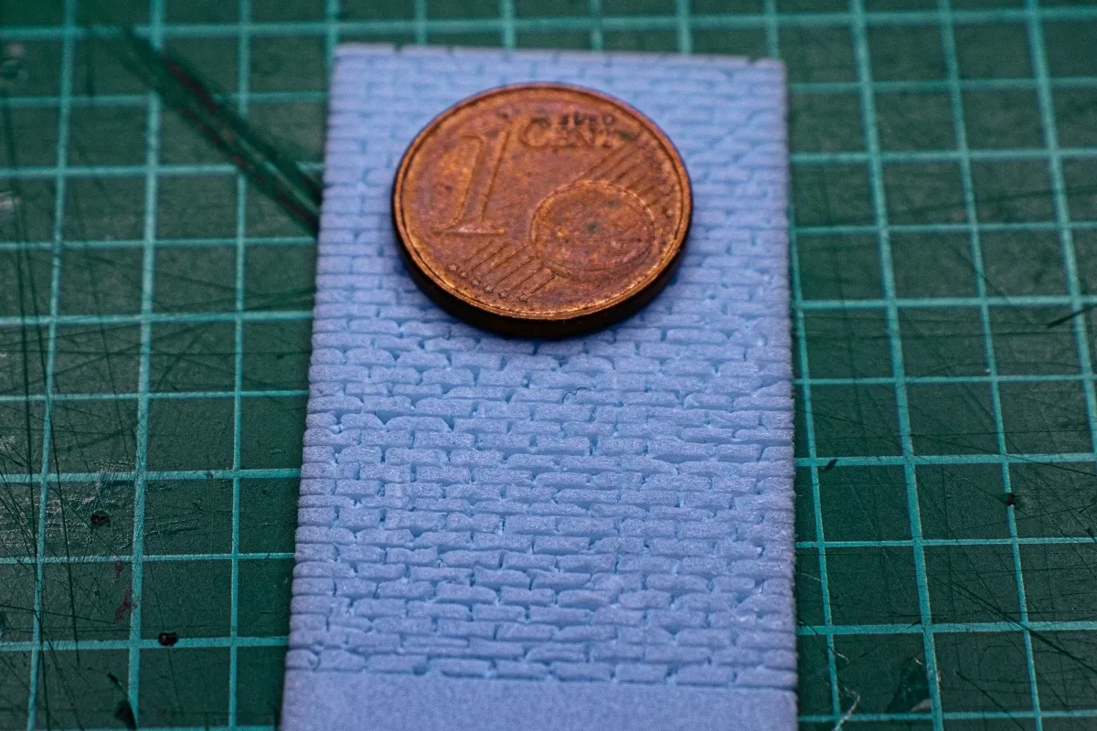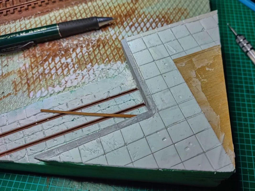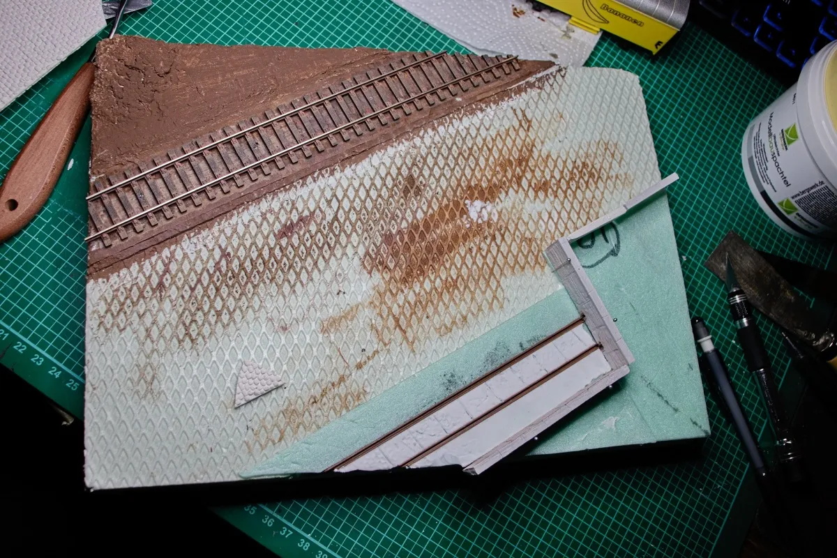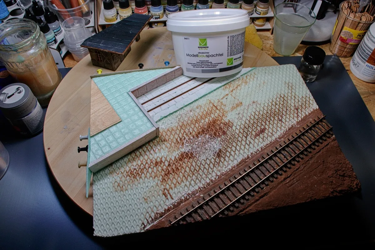 Diorama Rampe Farben für die LadestraßeFarbmuster bei einem Gipsstück.Die Ladestraße ist fertig - DetailaufnahmeDie Ladestraße ist fertigDie Ladestraße ist fertig verspachteltDie Ladestraße ist fertig verspachteltBergswerks Modellbauspachtel wird genutztDie Ladestraße ist fertig verspachteltDie Ladestraße ist fertig - GesamtübersichtDie Ladestraße ist fertig - DetailaufnahmeDie Ladestraße ist fertig - DetailaufnahmeDie Ladestraße ist fertig - GesamtübersichtDie Ladestraße ist fertig - Detailaufnahme... ein aufgefülltes Loch.... noch zu symstrischVerfahrensweise für das selbsthergestelltes KopfsteinpflasterZwischen Gleis und "Gipsstraße" fülle ich mit selbst geritzte Straße gefülltVergleich geritztes / geprägtes Styrofoam gegen Gipsabdruck aus der SpörleformEinbau der Tür und Stützen für den Träger. Erste BemahlungAbgüsse von Spörleform werden zurechtgelegtDetailaufnahme des LagerschuppensÜbersicht des DioramasEinritzen der Fläche auf der RampeDetails der LagertürTür zum Lagerschuppen. Auch die Winkel an der Tür werden versucht darzustellenEinbau der Tür zum Lagerschuppen und eines Doppel-T-Trägers aus KranschieneStellprobe mit LagerschuppenDteailaufnahme vom LagerschuppenStellprobeMit Modellbauspachtel von Bergswerk bekommt die Rampe eine DeckschichtStellprobe mit Deckschicht auf der RampeDie Rampe bekommt eine DeckschichtFertiges Dach - gealtert und mit KupferrinneVersuch der "Verkupferung" der Dachkante mit Liquid Copper Nr. 797 von vallejoStellprobe des Lagerschuppens auf dem DioramaVersuch der "Verkupferung" der Dachkante mit Liquid Copper Nr. 797 von vallejoStellprobe des Lagerschupppens auf dem DioramaAlterung des DachesUnterseite des Daches mit brauner Farbe eingestrichen.Der "Übeltäter" - Leider löst der Sekundenkleber die Färbung des "Kupferfolie"Leider löst der Sekundenkleber die Färbung des "Kupferfolie"Einfassung des Daches mit PVC-L-ProfilenAbmessung der Kupferfolie für die KupfereinfassungDetailaufnahme des Daches nach der BemalungDetailaufnahme des Daches nach der BemalungDetailaufnahme des Daches nach der BemalungDetailaufnahme des Daches nach der BemalungEinfärben des Unterbaues mit brauner FarbeNeuer Versuch des Daches. Das Sperrholz wird eingeritzt. Ähnlich einer HolzlattungWölbung des Daches nach dem trocknenDetailaufnahme der ungewollten Wölbung des Daches durch den HolzleimLeider wölbt sich das Dach durch den Kleber (Holzleim)Das Dach bekommt eine Dachkante aus PVC-ProfilenDas Dach bekommt eine Dachkante aus PVC-ProfilenProbeliegen des DachesProbeliegen der DachesStruktur / Feinheit / Farbe des Schleifpapiers (P400)Auf ein Träger sind Striche für die Breite der Bahnen aus SchleifpappierRückseite des Schleifpapiers mit Kennzeichung P400Detailaufnahme vom DachDetailaufnahme vom DachEin Stück nache dem anderenDetailaufnahme vom DachDetailaufnahme. Auch zwischen den Sparren wird aufgefülltUnterbau des DachesUnterbau des Daches ist fertigHolz für das DachDetailaufnahme der SparrenSparren des DachesSparren des DachesAbstützung der BalkenDie ersten Balken für das DachDie Wände des Lagerschuppens - StellprobeColoriereung der FensterStellprobeKurze Wand - Gefache fertig und die Fenster sind drin.Lange Wand - Gefache fertig und die Fenster sind drin.Aus dem "Muster" werden die Ziegel ausgeschnitten und eingefügt - 1:1Die "einfachen" Gefache sind fertigJedes einzelne Gefache wird mit Ziegel ausgefüllt.Erstellung der Zeigel für das Kreuzgefache. Das Kreuz wurde zuerst eingedrückt und dann die Ziegel eingeritzt.Jedes einzelne Gefache wird ausgefüllt1. Gefache mit ZiegelwandSupermakro ... Zieglwand1. Colorierung mit steingrauZiegelwand zum Vergleich eine 1-Cent-Münzefertige Ziegelwand für die GefacheErstellung ZiegelwandStellprobe der WändeDetailaufnahme StänderwerkStänderwerk mit Abtönfarbe braun bemaltDetailaufnahme. Das Ständerwerk hat Farbe bekommenVergleich Zeichnung un ModellDas Ständerwerk für die beiden Wände steht.Immer weider vergleichen ....geritzte Ziegelwand, Ständerwerk und Figur zur Probe1. Ständerwek und Test, ob das Verhältnis stimmtVersuch einer Ziegelwand1. Versuche eine ZiegelwandZeichnung 1:1 beider Wände des LagershuppensDie Rampe mit Grundrissplatte des LagerhausesStellprobe der Rampe. Mit Pins ist der Grundriss des Lagerhauses auf der Rampe zusehenalles eingespachtelt, graviert und die Rampe ist im Rohbau fertigArbeitstisch zum gießen der FormenGießen der Gipsteile aus SpörleformenEingravieren der Stöße zu den Beton-PlattenÜbersicht von oben.Stellprobe mit RampewändeErste Schicht ModellbauspachtelAbkleben der Gleise, bevor Spachtel drauf kommtDamit keine weiß durchscheint, wird alles mit Revellfarben angestrichenZuerst kommt 2mm Trittschalldämmung und dann Modelllbauspachtel von BergswerkFarbe getrocknetDetailaufnahme vom Farbauftrag mit RevellfarbenZweiter Farbauftrag mit Revell Rost mattRost für die GleiseErster Farbauftrag für die GleiseLinks aufgebohrt und verschliffen. Rechts Ursprung aus dem BausatzRost für die Gleise mit Burnt Umper von VallejoÜberblick aller Teile während dem ZusammenbausJede gegossene Platte, auch wenn kaputt, wird genutzt.Lage auf dem Diorame. Perfekt.Test mit den Radsätzen, wie weit kann ich mit den T-Profilen an die SchienenGanz schön eng. Aber es ist ein Diorama und dafür ist es gut.Fertiges Schienenstück für die StraßeDie T-Profile sind verklebt.Test, ob die Idee mit dem T-Profil so passt und die Räder genug Spiel haben.Basteltischansicht.Benutzter Sekundenkleber von BergswerkErstes Teil ist geklebtAnrauen des Polystorol für das kleben.Beide Gleise sind mit Sekundenkleber auf das Polystorol geklebtGenaues ausrichten der Gleise in den Gleisspanner3 mm Polystorol wird auf die Gleise geklebt.Genaues einspannen der Schienen in die GleisspannerAnrauen der Unterseite der Schienen, damit sie besser kleben.Inspiration aus dem Buch "Perfekt bis ins Detail"Erster Versuch das Gleis zu versenken.Mein Basteltisch nach dem ersten Basteltag.Gle