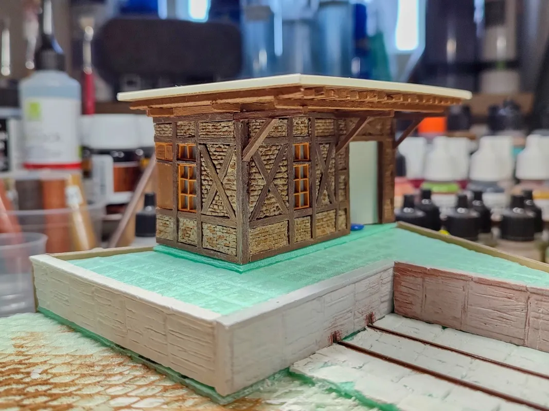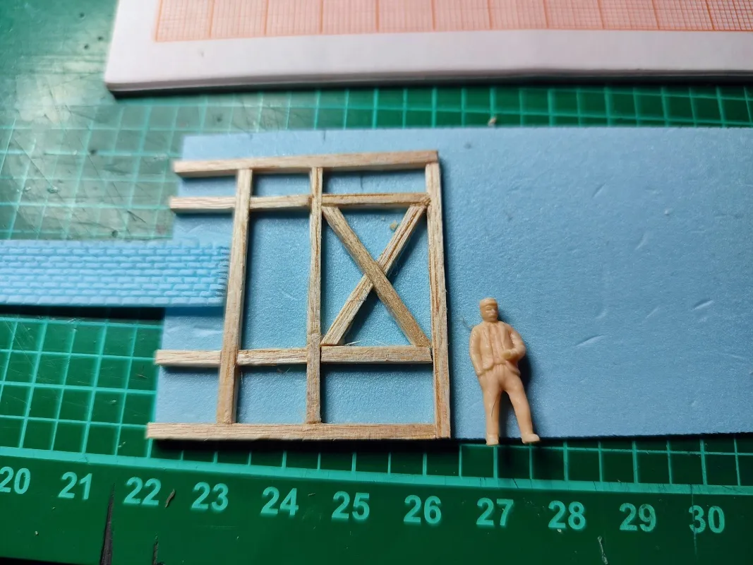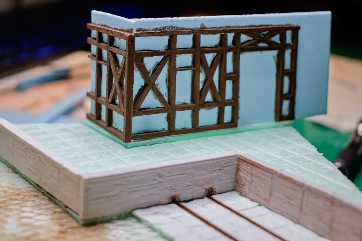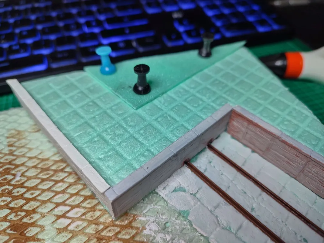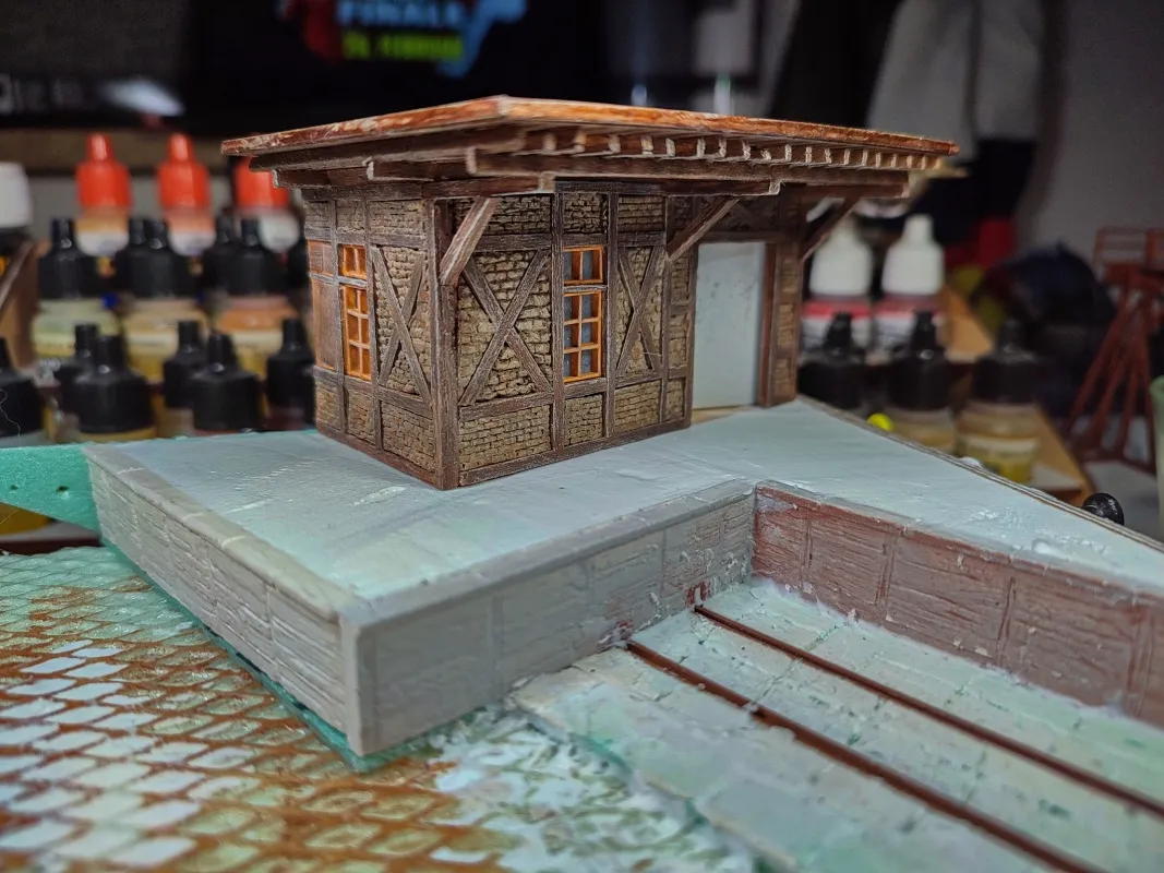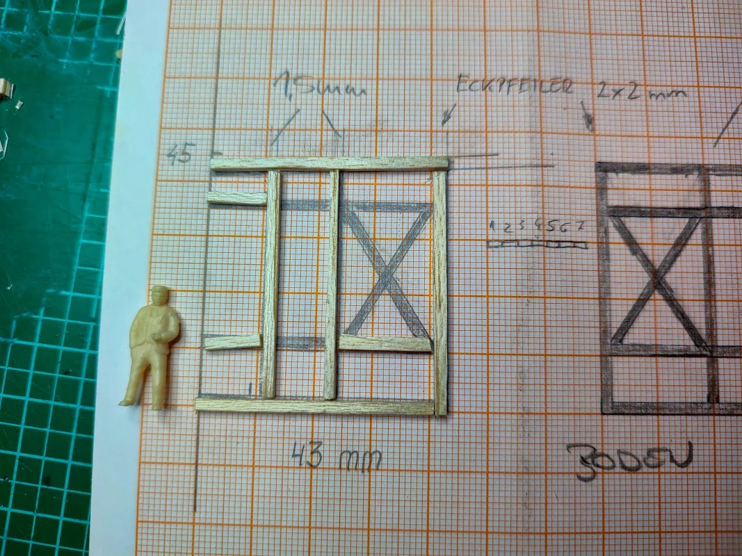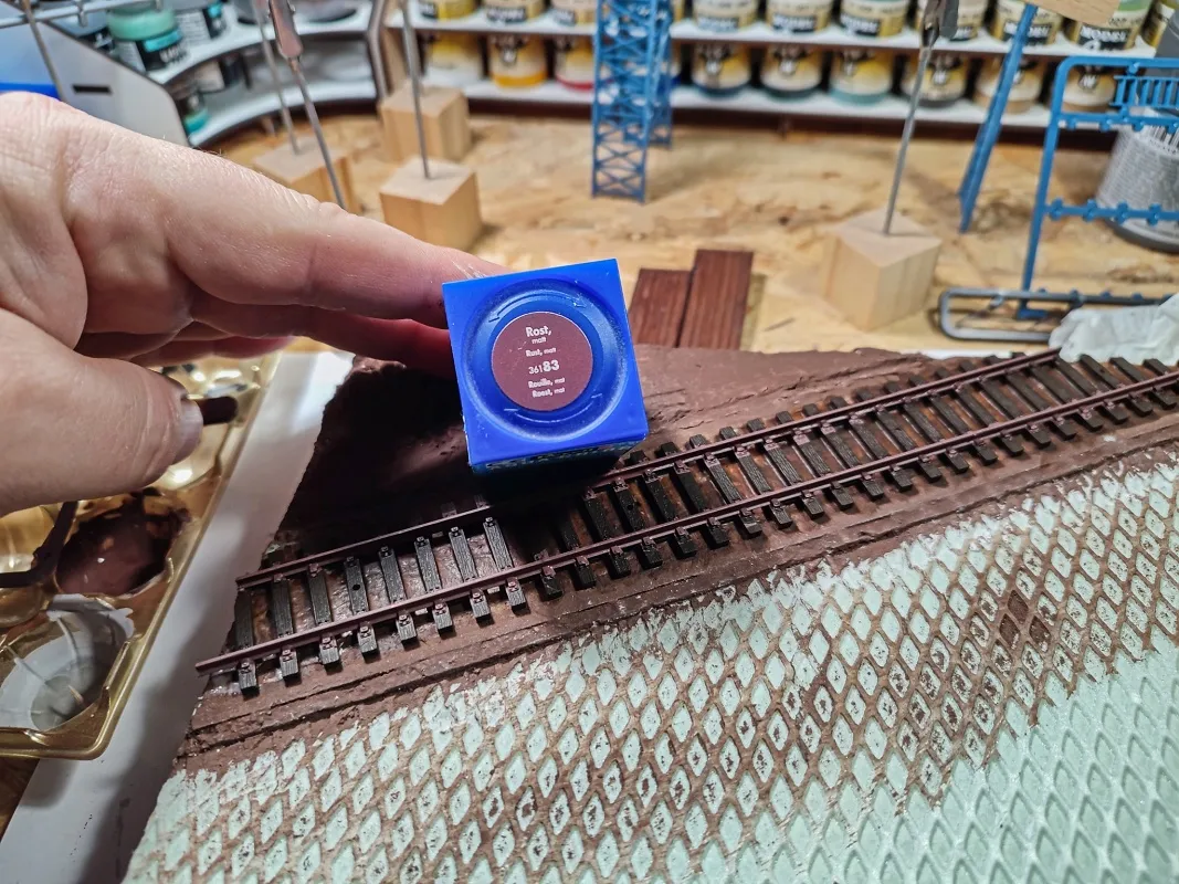 Diorama Rampe Farben für die LadestraßeFarbmuster bei einem Gipsstück.Die Ladestraße ist fertig - DetailaufnahmeDie Ladestraße ist fertigDie Ladestraße ist fertig verspachteltDie Ladestraße ist fertig verspachteltBergswerks Modellbauspachtel wird genutztDie Ladestraße ist fertig verspachteltDie Ladestraße ist fertig - GesamtübersichtDie Ladestraße ist fertig - DetailaufnahmeDie Ladestraße ist fertig - DetailaufnahmeDie Ladestraße ist fertig - GesamtübersichtDie Ladestraße ist fertig - Detailaufnahme... ein aufgefülltes Loch.... noch zu symstrischVerfahrensweise für das selbsthergestelltes KopfsteinpflasterZwischen Gleis und "Gipsstraße" fülle ich mit selbst geritzte Straße gefülltVergleich geritztes / geprägtes Styrofoam gegen Gipsabdruck aus der SpörleformEinbau der Tür und Stützen für den Träger. Erste BemahlungAbgüsse von Spörleform werden zurechtgelegtDetailaufnahme des LagerschuppensÜbersicht des DioramasEinritzen der Fläche auf der RampeDetails der LagertürTür zum Lagerschuppen. Auch die Winkel an der Tür werden versucht darzustellenEinbau der Tür zum Lagerschuppen und eines Doppel-T-Trägers aus KranschieneStellprobe mit LagerschuppenDteailaufnahme vom LagerschuppenStellprobeMit Modellbauspachtel von Bergswerk bekommt die Rampe eine DeckschichtStellprobe mit Deckschicht auf der RampeDie Rampe bekommt eine DeckschichtFertiges Dach - gealtert und mit KupferrinneVersuch der "Verkupferung" der Dachkante mit Liquid Copper Nr. 797 von vallejoStellprobe des Lagerschuppens auf dem DioramaVersuch der "Verkupferung" der Dachkante mit Liquid Copper Nr. 797 von vallejoStellprobe des Lagerschupppens auf dem DioramaAlterung des DachesUnterseite des Daches mit brauner Farbe eingestrichen.Der "Übeltäter" - Leider löst der Sekundenkleber die Färbung des "Kupferfolie"Leider löst der Sekundenkleber die Färbung des "Kupferfolie"Einfassung des Daches mit PVC-L-ProfilenAbmessung der Kupferfolie für die KupfereinfassungDetailaufnahme des Daches nach der BemalungDetailaufnahme des Daches nach der BemalungDetailaufnahme des Daches nach der BemalungDetailaufnahme des Daches nach der BemalungEinfärben des Unterbaues mit brauner FarbeNeuer Versuch des Daches. Das Sperrholz wird eingeritzt. Ähnlich einer HolzlattungWölbung des Daches nach dem trocknenDetailaufnahme der ungewollten Wölbung des Daches durch den HolzleimLeider wölbt sich das Dach durch den Kleber (Holzleim)Das Dach bekommt eine Dachkante aus PVC-ProfilenDas Dach bekommt eine Dachkante aus PVC-ProfilenProbeliegen des DachesProbeliegen der DachesStruktur / Feinheit / Farbe des Schleifpapiers (P400)Auf ein Träger sind Striche für die Breite der Bahnen aus SchleifpappierRückseite des Schleifpapiers mit Kennzeichung P400Detailaufnahme vom DachDetailaufnahme vom DachEin Stück nache dem anderenDetailaufnahme vom DachDetailaufnahme. Auch zwischen den Sparren wird aufgefülltUnterbau des DachesUnterbau des Daches ist fertigHolz für das DachDetailaufnahme der SparrenSparren des DachesSparren des DachesAbstützung der BalkenDie ersten Balken für das DachDie Wände des Lagerschuppens - StellprobeColoriereung der FensterStellprobeKurze Wand - Gefache fertig und die Fenster sind drin.Lange Wand - Gefache fertig und die Fenster sind drin.Aus dem "Muster" werden die Ziegel ausgeschnitten und eingefügt - 1:1Die "einfachen" Gefache sind fertigJedes einzelne Gefache wird mit Ziegel ausgefüllt.Erstellung der Zeigel für das Kreuzgefache. Das Kreuz wurde zuerst eingedrückt und dann die Ziegel eingeritzt.Jedes einzelne Gefache wird ausgefüllt1. Gefache mit ZiegelwandSupermakro ... Zieglwand1. Colorierung mit steingrauZiegelwand zum Vergleich eine 1-Cent-Münzefertige Ziegelwand für die GefacheErstellung ZiegelwandStellprobe der WändeDetailaufnahme StänderwerkStänderwerk mit Abtönfarbe braun bemaltDetailaufnahme. Das Ständerwerk hat Farbe bekommenVergleich Zeichnung un ModellDas Ständerwerk für die beiden Wände steht.Immer weider vergleichen ....geritzte Ziegelwand, Ständerwerk und Figur zur Probe1. Ständerwek und Test, ob das Verhältnis stimmtVersuch einer Ziegelwand1. Versuche eine ZiegelwandZeichnung 1:1 beider Wände des LagershuppensDie Rampe mit Grundrissplatte des LagerhausesStellprobe der Rampe. Mit Pins ist der Grundriss des Lagerhauses auf der Rampe zusehenalles eingespachtelt, graviert und die Rampe ist im Rohbau fertigArbeitstisch zum gießen der FormenGießen der Gipsteile aus SpörleformenEingravieren der Stöße zu den Beton-PlattenÜbersicht von oben.Stellprobe mit RampewändeErste Schicht ModellbauspachtelAbkleben der Gleise, bevor Spachtel drauf kommtDamit keine weiß durchscheint, wird alles mit Revellfarben angestrichenZuerst kommt 2mm Trittschalldämmung und dann Modelllbauspachtel von BergswerkFarbe getrocknetDetailaufnahme vom Farbauftrag mit RevellfarbenZweiter Farbauftrag mit Revell Rost mattRost für die GleiseErster Farbauftrag für die GleiseLinks aufgebohrt und verschliffen. Rechts Ursprung aus dem BausatzRost für die Gleise mit Burnt Umper von VallejoÜberblick aller Teile während dem ZusammenbausJede gegossene Platte, auch wenn kaputt, wird genutzt.Lage auf dem Diorame. Perfekt.Test mit den Radsätzen, wie weit kann ich mit den T-Profilen an die SchienenGanz schön eng. Aber es ist ein Diorama und dafür ist es gut.Fertiges Schienenstück für die StraßeDie T-Profile sind verklebt.Test, ob die Idee mit dem T-Profil so passt und die Räder genug Spiel haben.Basteltischansicht.Benutzter Sekundenkleber von BergswerkErstes Teil ist geklebtAnrauen des Polystorol für das kleben.Beide Gleise sind mit Sekundenkleber auf das Polystorol geklebtGenaues ausrichten der Gleise in den Gleisspanner3 mm Polystorol wird auf die Gleise geklebt.Genaues einspannen der Schienen in die GleisspannerAnrauen der Unterseite der Schienen, damit sie besser kleben.Inspiration aus dem Buch "Perfekt bis ins Detail"Erster Versuch das Gleis zu versenken.Mein Basteltisch nach dem ersten Basteltag.Gle